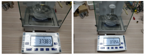 - 重復(fù)剛才的步驟擦拭干剛才測的2號陶瓷材料,確保不沾有一點(diǎn)水。把陶瓷材料放在稱重架上,重復(fù)前面兩個(gè)操作步驟。得出以下的測量結(jié)果。