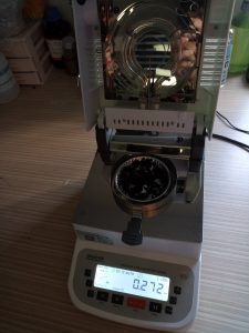 為了使測(cè)試過(guò)程中電池粉末水分儀將電池粉末烘干烘透,我們將電池粉末分散開(kāi)來(lái),以便溫度能滲透進(jìn)電池粉末內(nèi)部。取7克多電池粉末撒于不銹鋼托盤中,用鑷子將電池粉末平鋪均勻,為避免電池粉末經(jīng)過(guò)高溫度加熱后變性,我們將溫度設(shè)置在140℃,按“START”鍵開(kāi)始測(cè)試,2分10秒后檢測(cè)結(jié)束,檢測(cè)數(shù)據(jù)顯示272%;