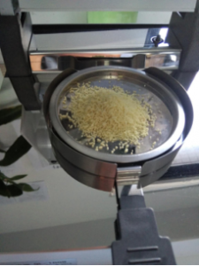 第三步,往測(cè)試樣品盤上倒入樣品,不宜過多,也不宜太少,一般取5~10克即可。(不同產(chǎn)品取的克重不同)。雞精我們?nèi)?克來測(cè)量即可
