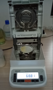 二、儀器本身有個自動降溫過程,為求得數(shù)據(jù)的準(zhǔn)確性,故在進(jìn)行第二次測量的時候先等待幾分鐘,使儀器顯示溫度為40度以下時再進(jìn)行第二次測量,這次我們加大膠水樣品量為7.025克,將膠水均勻滴于鋁箔盤上,溫度照樣設(shè)定在120℃,按“START”鍵開始進(jìn)行測試,由于這次的膠水量比較多,所以儀器此次用了17分鐘43秒才測試結(jié)束,測試結(jié)果數(shù)據(jù)顯示31.17%(含水率),按“單位鍵”切換其顯示數(shù)據(jù),則屏幕顯示其固含量為68.83%。