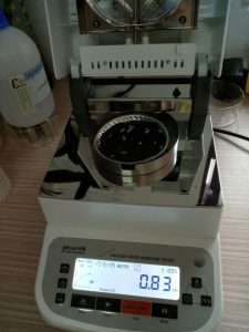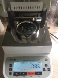• 測(cè)試稀土:為了使測(cè)試過(guò)程中稀土水分測(cè)試儀將稀土烘干烘透,我們將稀土分散開(kāi)來(lái),以便溫度能滲透進(jìn)稀土內(nèi)部。取1克多稀土撒于不銹鋼托盤中,用勺子將稀土平鋪均勻至鋪滿整個(gè)盤中,為避免稀土高溫烘烤后除水分外的其他物質(zhì)也同樣揮發(fā)掉,我們將溫度設(shè)置在100℃就好,按“START”鍵開(kāi)始測(cè)試,2分03秒后檢測(cè)結(jié)束,檢測(cè)數(shù)據(jù)顯示0.86%;
