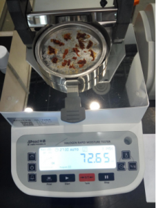 用鑷子提取2.2克牛肉肉末,置于不銹鋼托盤中,用鑷子將牛肉肉末平鋪均勻,溫度設(shè)置145℃用儀器進(jìn)行加熱,檢測結(jié)束,檢測數(shù)據(jù)顯示71.16%;為了檢測儀器的精確性,待儀器溫度降至50℃以下時(shí)進(jìn)行第二次測量,用實(shí)驗(yàn)勺提取2.2克牛肉,置于不銹鋼托盤中,用實(shí)驗(yàn)勺將面粉平鋪均勻,溫度設(shè)置150℃用儀器進(jìn)行加熱,檢測結(jié)束,檢測數(shù)據(jù)顯示71.85%;